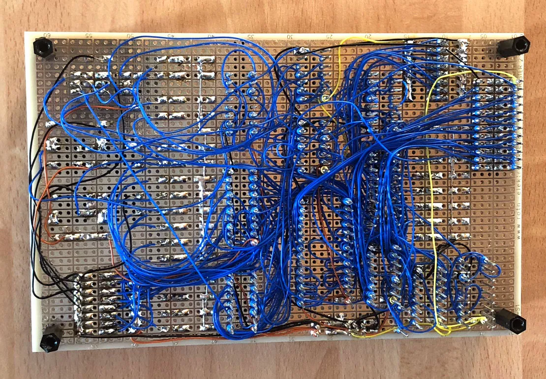 I don’t think the 74HC259 output latch I’m using is the right thing for the job at the moment due to its timing requirements, either that or I’ve messed up something elsewhere. But latch 0 on this chip is getting triggered at the wrong time, meaning my onboard output LED 0 is often on when a program is running. Not ideal, but works well enough for me playing around with this.
