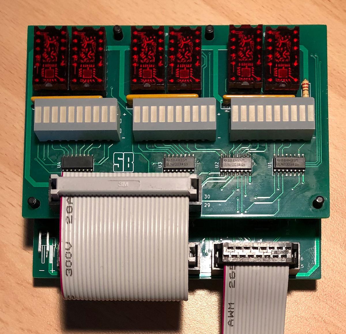 The main logic board then simply contains the 3 register latches, the function EEPROM, and the pair of 74LS181 ALUs. A ribbon cable sends the output of all of these to the display board.